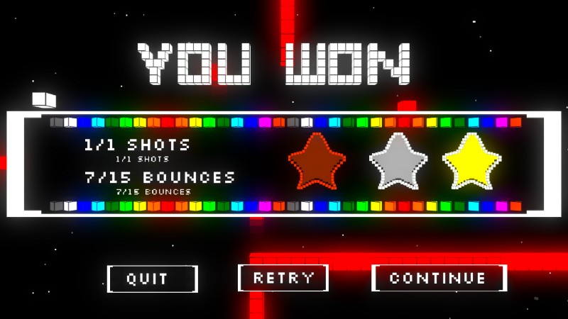 At the beginning, you’re presented with one world that contains 8 levels and a boss fight. Instead of having a goal, a boss fight requires the player to use the cube to destroy a boss or complete a challenge such as destroying a certain number of falling objects. A handful of boss challenges are designed in reference to other games and often have a high number of launches and bounces allowed. After beating all of the levels in a world, the next is unlocked.
